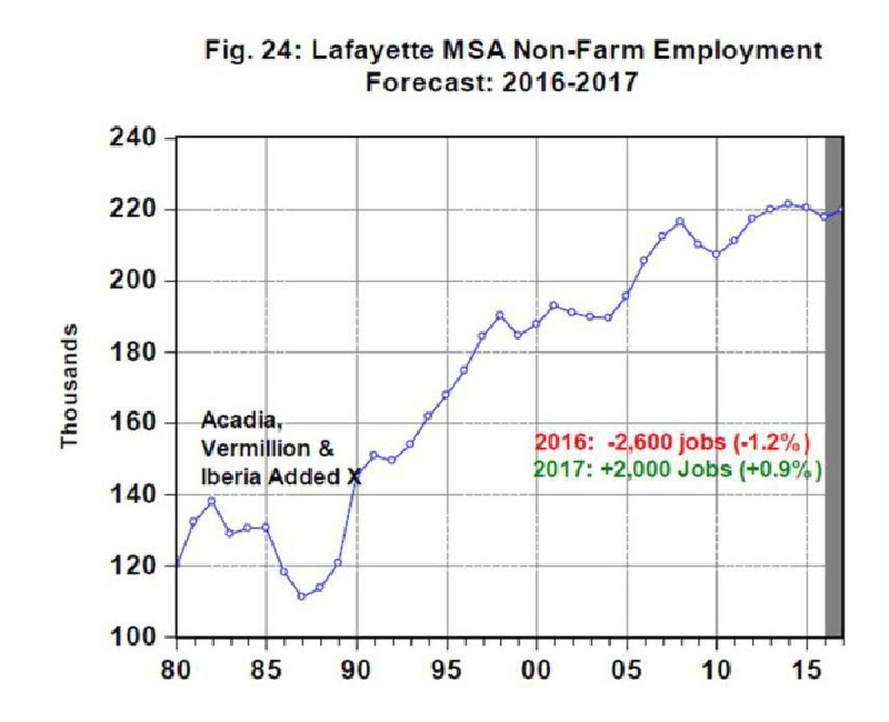 To keep you from having to read the entire 129 page report (at the bottom of this post), I will recap some of his comments and have included a few of the most pertinent charts for Acadiana. While reading the entire report would be a daunting task, I do highly recommend a quick read of his three-page Executive Summary for a quick statewide overview of his forecast.